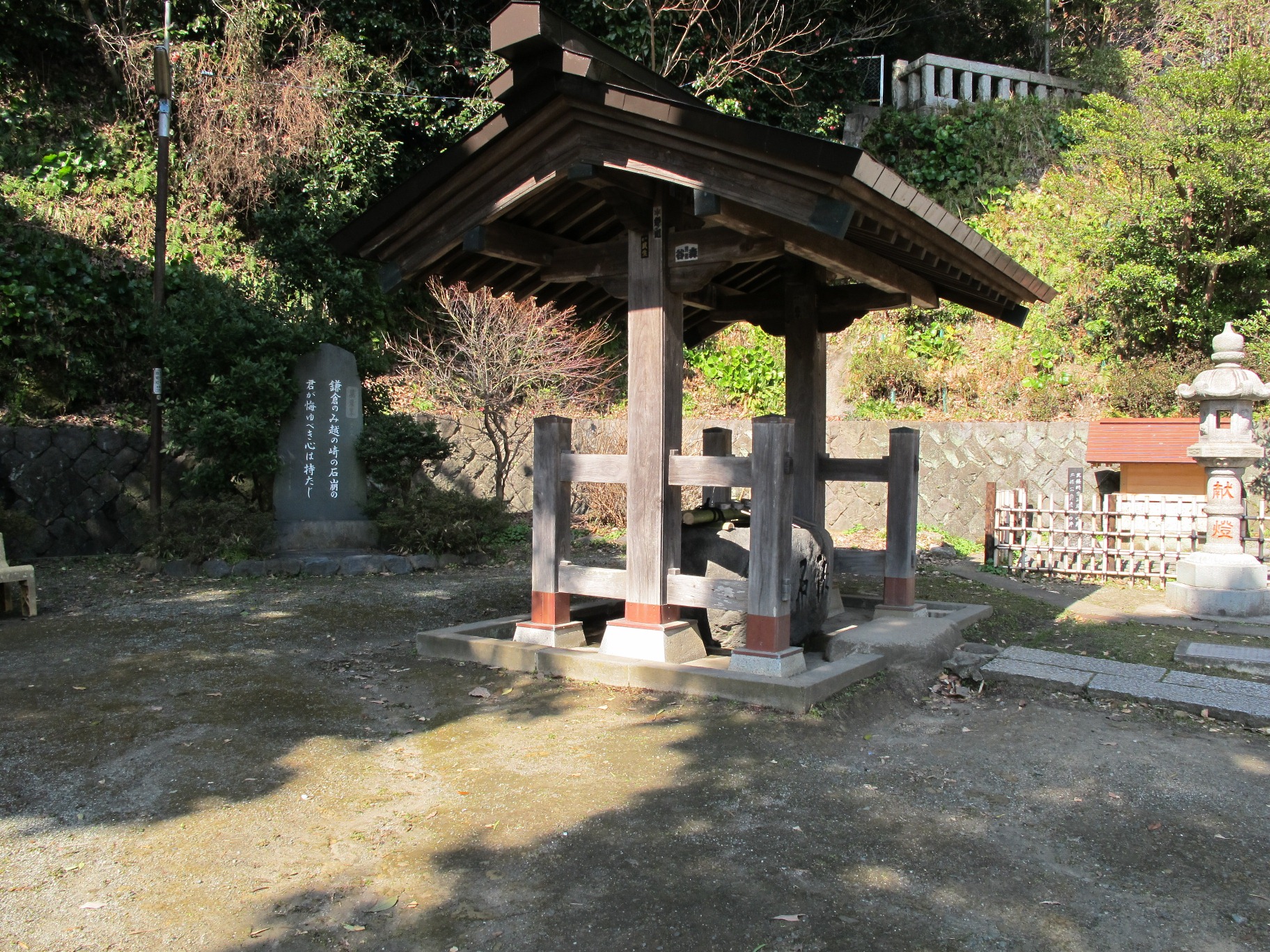 由比ガ浜通りから鎌倉消防署長谷出張所横を入っていくとあるのは甘縄神明宮である。祭神は天照大神(あまてらすおおみかみ)・倉稲魂命(うがのみたま)・伊邪那美命(いさなみのみこと)・武甕槌神(たけみかずちのかみ)・菅原道真。長谷の鎮守で、もと村社。社伝によれば、その創建は和銅三年(710)、土地の豪族染谷太郎時忠が山上に甘縄神明宮、下に御輿山円徳寺という寺を建てたことに始まるという。明治初年の神仏分離令で寺は廃寺になった。本尊は地蔵であったらしい。源頼義がこの神明社に祈り、生まれたのが八幡太郎義家であったという。このことから康平六年(1063)に頼義は社を修理した。よって源氏とこの社の関係は深かった。頼朝や政子、実朝の参拝などの記事で『吾妻鏡』にたびたび社の名前が出てくる。甘縄は長谷の古名で、鎌倉御家人で北条氏の外戚であった安達氏の屋敷があった地である。時宗は建長三年(1251)五月十五日、時頼の母松下禅尼の邸宅があるこの甘縄の地で生まれた(時宗の母は北条重時の娘である)。現在、境内には「北条時宗公産湯の井」がある。明治二十年(1887)には、長谷寺鎮守の五社明神を合祀し、昭和七年(1932)に甘縄神明宮に改称した。それ以前は単に神明宮、神明社と称していた。